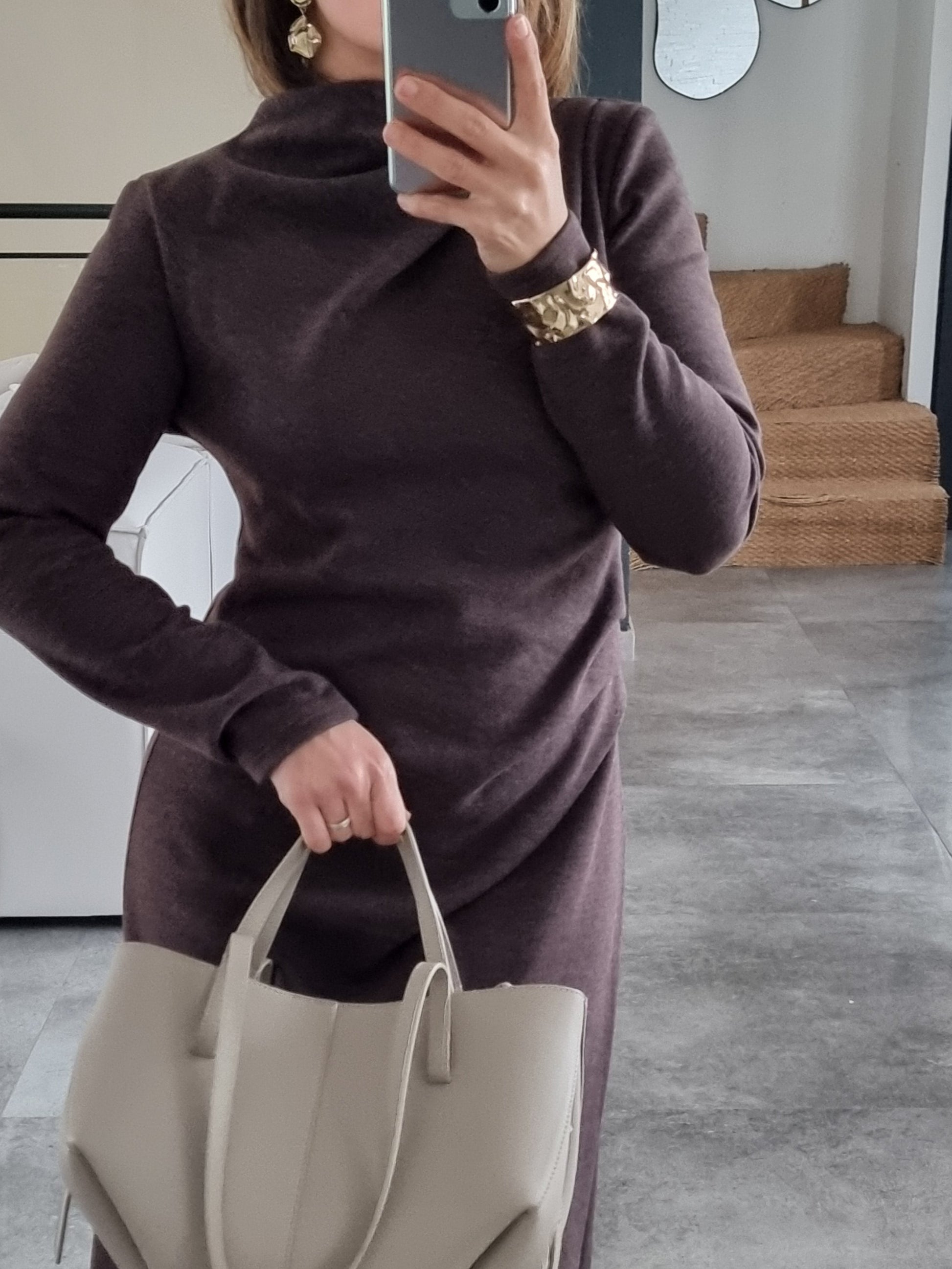 Robe midi en tissu doux au toucher, à manches longues, avec col rond et détail de fronces.
